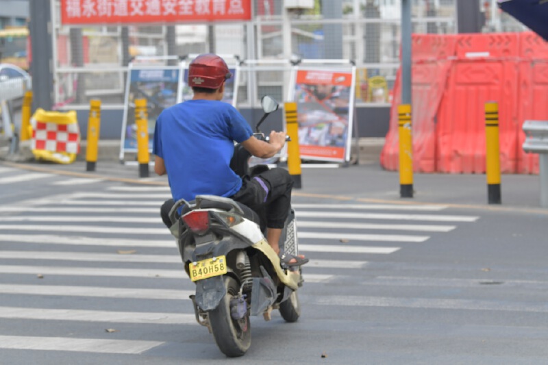 在福永街道怀德南路福中路口,市民未正确佩戴安全头盔骑乘电动二轮车。