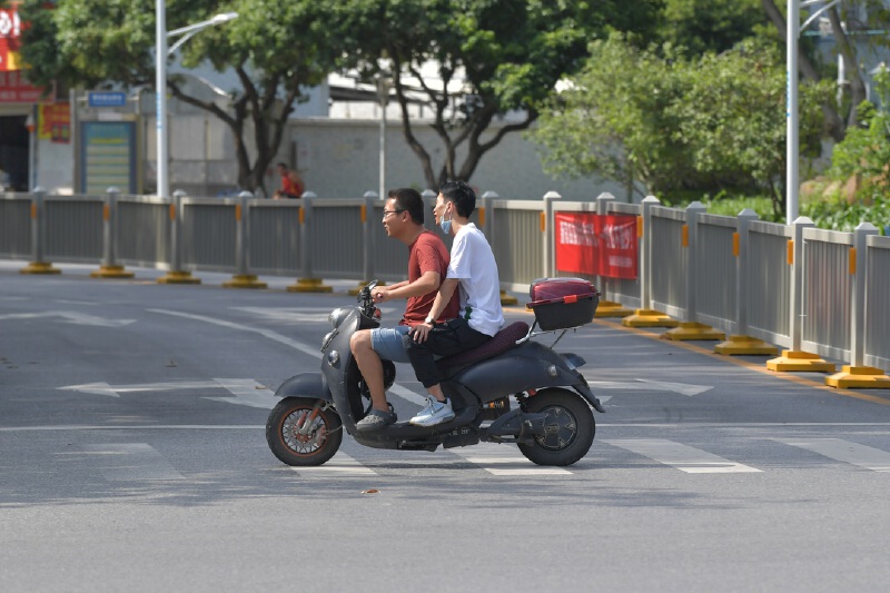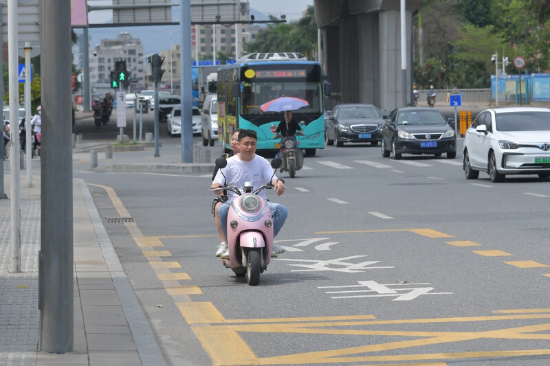 在新安街道宝安大道创业一路,市民在机动车道上载人骑乘电动二轮车。