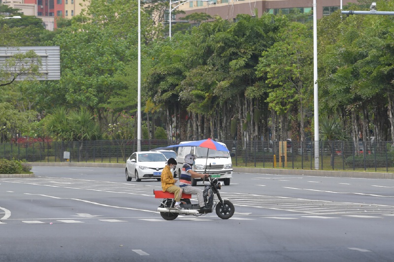 在松岗街道松安路宝安大道路口,市民载人骑乘加装雨棚的电动二轮车。