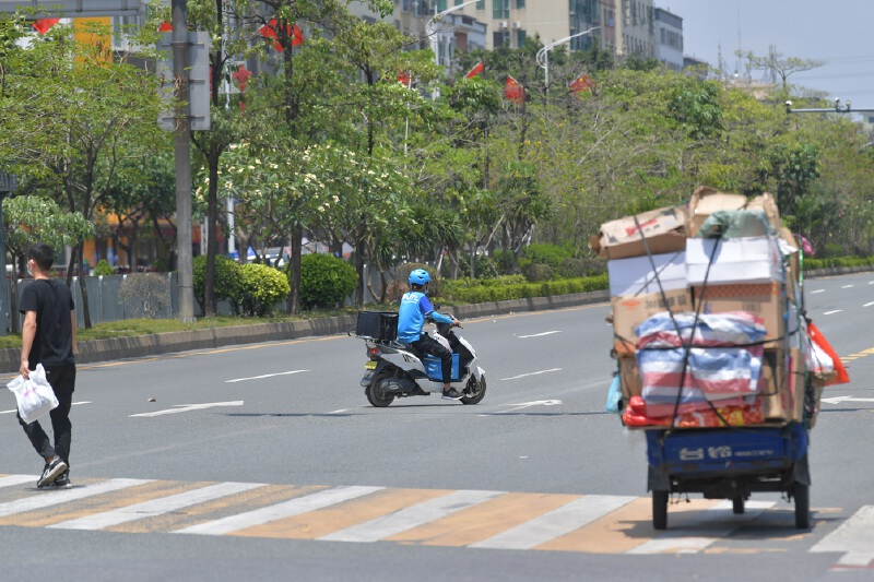 在燕罗街道广田路工业大道路口,外卖人员在机动车道上骑乘电动二轮车。