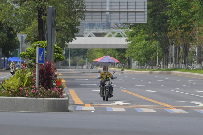 在西乡街道宝安大道西乡大道路口,市民在机动车道上骑乘电动二轮车。