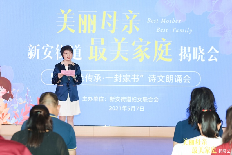 温情母亲节,激荡巾帼红。5月7日下午,新安街道“美丽母亲”“最美家庭”揭晓会暨“红色传承 一封家书”诗文朗诵会在海纳百川大厦举行,为“美丽母亲”“最美家庭”获奖者颁发纪念证书,送上鲜花、祝福。宝安区朗诵家协会成员还与获奖代表共同通过“红色家书”诵读,学党史,悟思想,致敬巾帼英雄,传承好家风好家训。