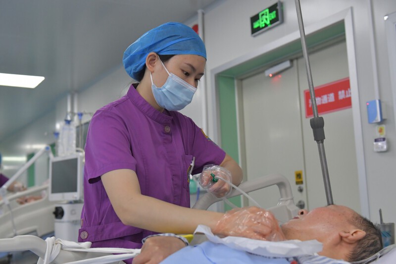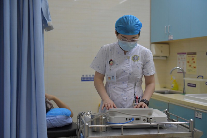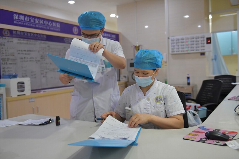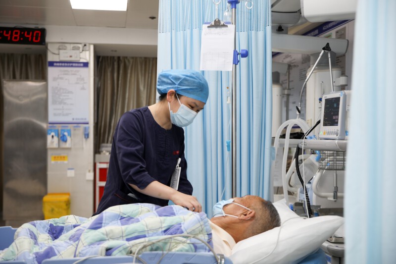 ▲宝安人民医院(集团)第一人民医院急诊科护士李婷在照看病人。