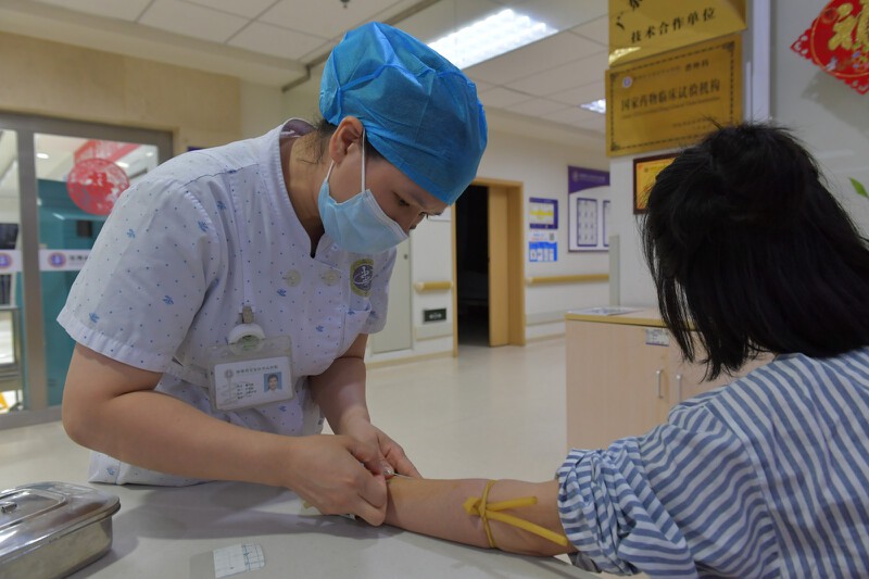 ▲护士曹红梅为新入院的病人扎针抽血。