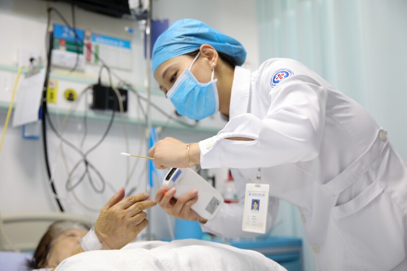 ▲宝安人民医院(集团)第一人民医院心血管内科护士鲍慧琴准备给病人测血糖。