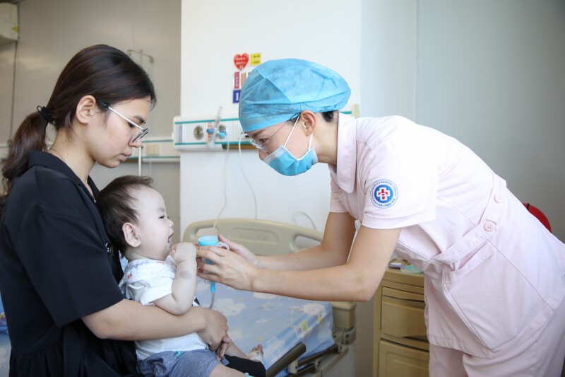 ▲宝安人民医院(集团)第一人民医院儿科护士王瑶为患儿做雾化。
