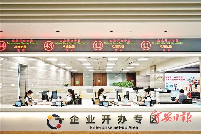 宝安区行政服务大厅位于宝安中心区,地理位置优越,交通环境便利。走进大厅,整洁、明亮、舒适的环境让人耳目一新,问讯处、自助办理区、自助查询区、填表区、茶水间、党代表工作室、办事窗口、母婴室、洗手间、24小时自助服务区等各类功能区公共标识设置齐全、指引清晰,同时还标注着中、英、日、韩四种语言。“这里的工作人员服务热情、文明礼貌,办事也非常高效,还有免费复印、免费刻章,真的非常便利!”前来办理企业注册业务的李小姐表示。