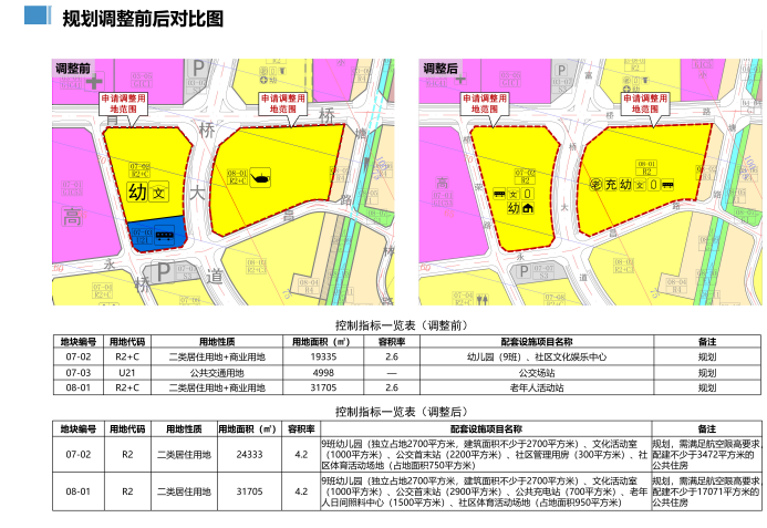 07-02、07-03地块合并为一个地块,地块编号为07-02,用地面积为24333平方米,用地性质调整为二类居住用地,容积率调整为4.2,配套9班幼儿园(独立占地2700平方米,建筑面积不少于2700平方米)、文化活动室(1000平方米)、公交首末站(2200平方米)、社区管理用房(300平方米)、社区体育活动场地(占地面积750平方米),备注为“规划,需满足航空限高要求,配建不少于3472平方米的公共住房”。
