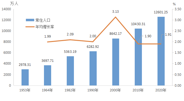 2020年11月1日零时,广东常住人口达12601.25万人。与2010年第六次全国人口普查比较,全省常住人口增加2170.94万人,增长20.81%,平均每年增加217.09万人,年平均增长率为1.91%,增速与上一个十年的年均增速(1.90%)基本持平,且略有提高。自2007年以来,广东连续14年常住人口规模居全国首位,占全国人口总量从2010年的7.79%提高到8.93%,提高1.14个百分点。
