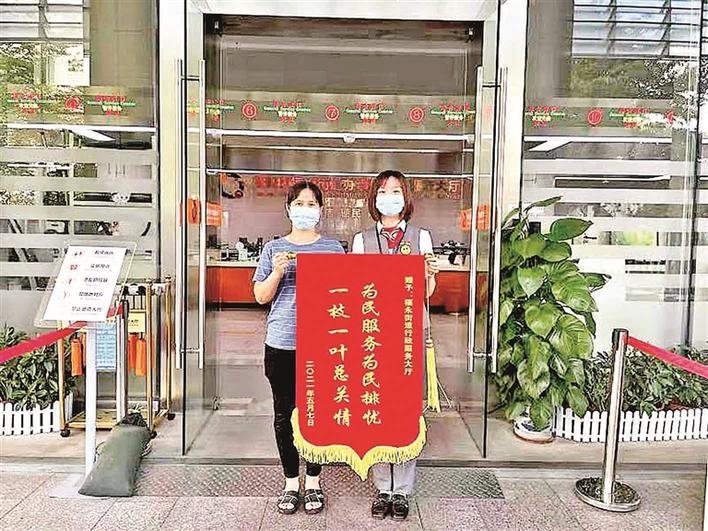 无独有偶,市民刘女士因未提前提交相关资料,未能顺利办理房屋租赁变更登记备案业务。大厅管理员马蝶欣听说了刘女士的情况后,耐心引导其在家进行网上申办,并告知其可通过委托形式让家人代为领证,马蝶欣还积极对接业务审批部门为刘女士加急办理。深受感动的刘女士在前来领证时,向福永街道行政服务大厅的工作人员赠送锦旗表达谢意。