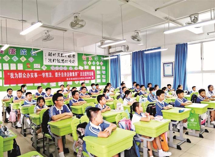 宝安日报讯(记者 罗慧怡 通讯员 李菲 邹晓淳 文/图)青少年是宪法宣传教育的重点对象,为引导青少年从小掌握宪法法律知识,日前,西乡街道综合治理办(司法所)联合流塘社区普法专干在流塘小学五年级5班开展“宪法”专题法律知识讲座及“向宪法宣誓”活动,讲座由深圳华篆律师事务所黄焕君律师主讲,58名学生参加讲座。