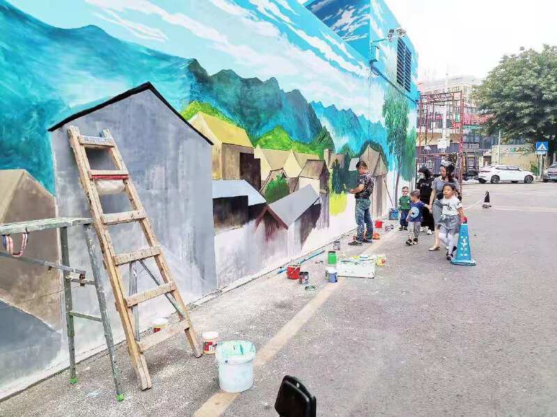 墙体彩绘以“乡村田园风光”为主题,专业画师精心设计宣传图画,用颜料对社区公共墙体进行绘制,将单调、不起眼的小区一角变成社区精神文明风尚的新视窗。打造一道和谐、文明、人文、艺术的社区风景线。彩绘过程中,也引来了很多小区居民驻足观看,居民们表示:“这面墙平时大家都不会注意到,经过改造之后让整个小区都好看起来,而且还起到了很好的教育引导作用。”