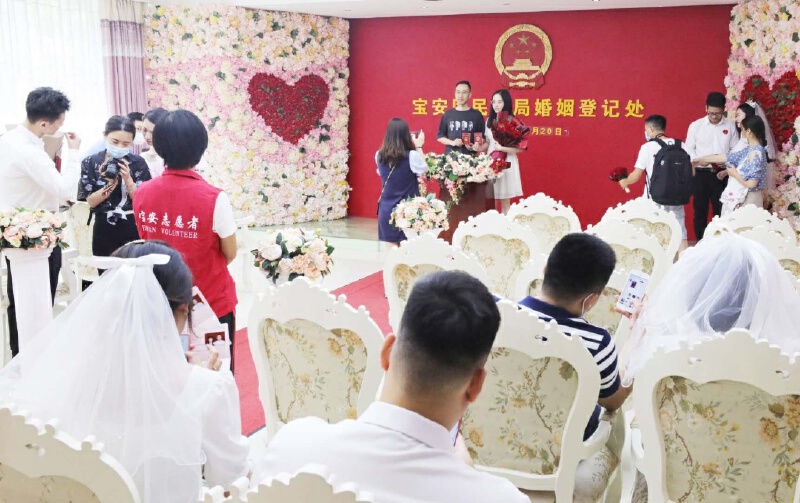 截至当天下午5时30分,宝安区民政局婚姻登记处共受理结婚登记155对,其中153对成功办理结婚登记,2对因证件不齐未能办理。