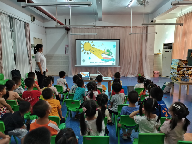蒲公英讲师来到幼儿园,小朋友们兴致高昂跟蒲公英老师打招呼,端正坐在自己小板凳上认真听讲师讲解垃圾分类知识。为了让小朋友们更直观地了解垃圾分类知识和正确投放垃圾,蒲公英讲师给小朋友们播放垃圾分类动画片,让小朋友们懂得垃圾分类的重要性、掌握垃圾分类的方法。
