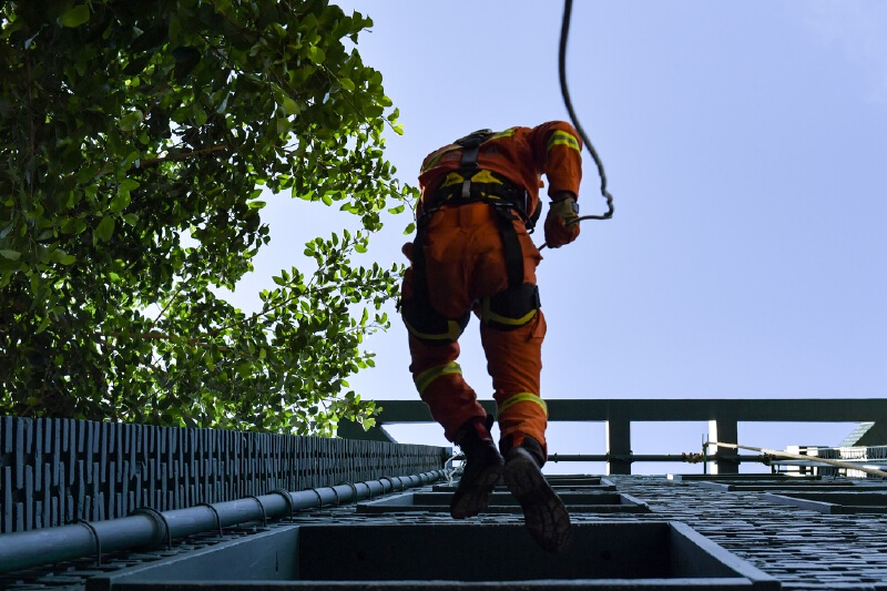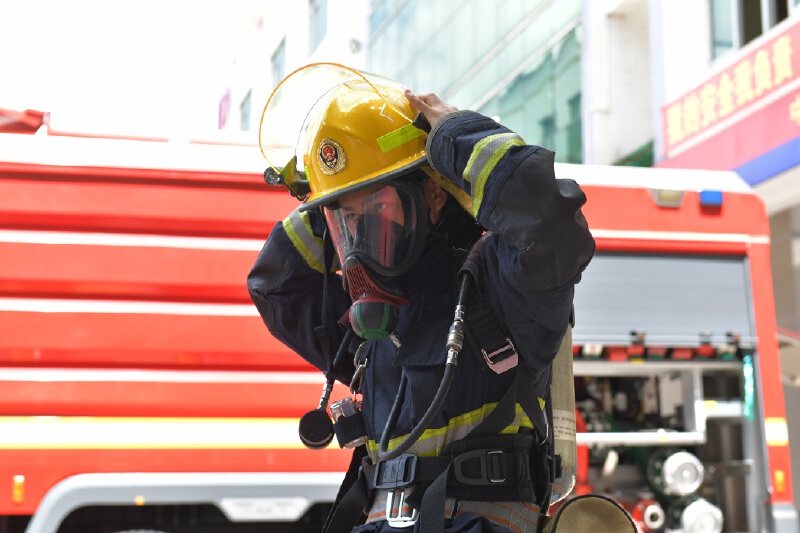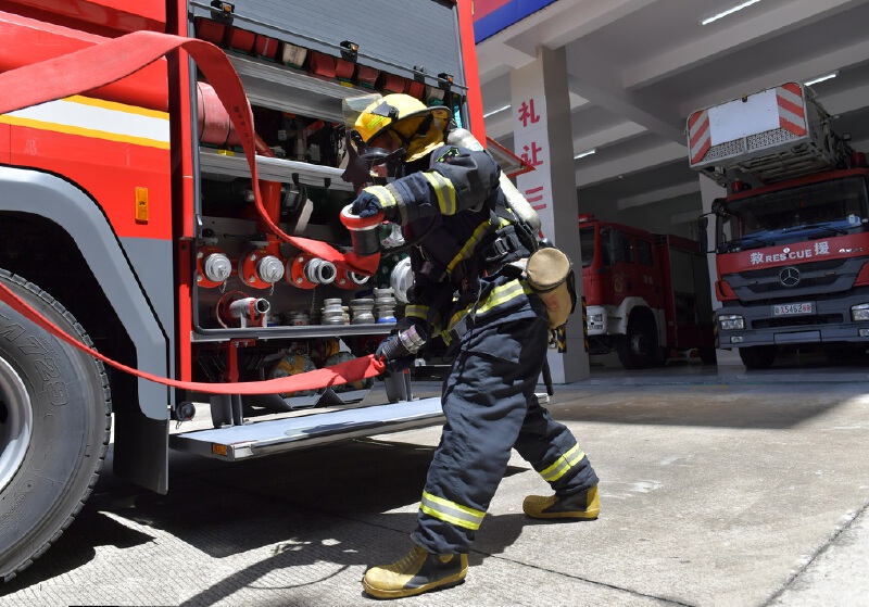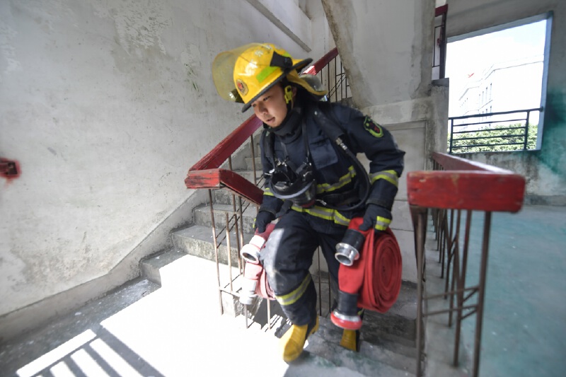 指战员全副武装参加消防救援训练。