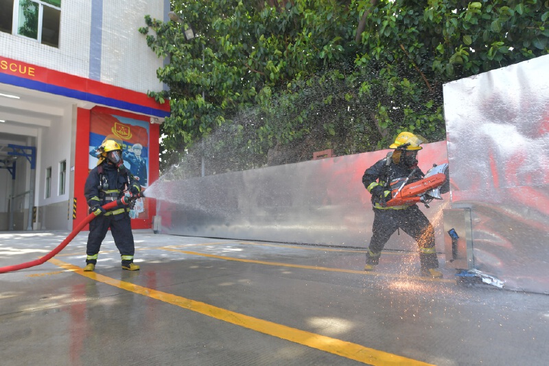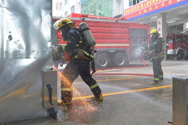 训练场上,指战员陈宇铭端着破拆工具对铁门进行破拆,齿轮转动,火花四溅,另一名指战员端着水枪不停地打水降温。“这是纵深灭火救援操,如果在燃气泄漏等易燃易爆的条件下进行火灾救援,破拆铁门时,飞溅的火花容易立刻造成爆炸,所以在破拆时,必须打水作业。”罗杰说。