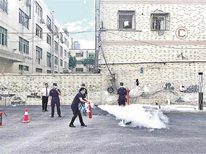 在第二阶段的灭火实操演练中,宝安区第二十专职消防队现场讲解和示范手提式灭火器的操作注意事项及使用方法,并指导两人一组进行灭火实操演练。