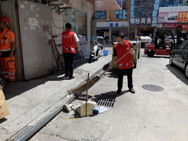 社区党委书记与工作人员一起打扫楼道、清理垃圾