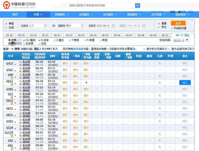 6月11日当天,北京至郑州方向高铁列车车票销售情况(12306官网截图)