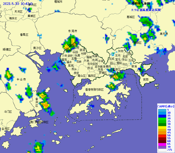 深圳市气象台5月30日12时25分发布,目前珠江口生成的雷雨云图正在影响我市宝安和光明等区,过去1小时记录到最大雨量8.2毫米(宝安区新桥街道万丰站)。预计未来1小时我市宝安、光明和龙华等地将继续受雷雨影响,部分时间雨势较大,累计雨量5-20毫米,雷雨时可能伴有7级左右短时大风。未来2小时我市其他地方也将出现分散雷阵雨,全市雷电预警信号生效中,请注意防御。