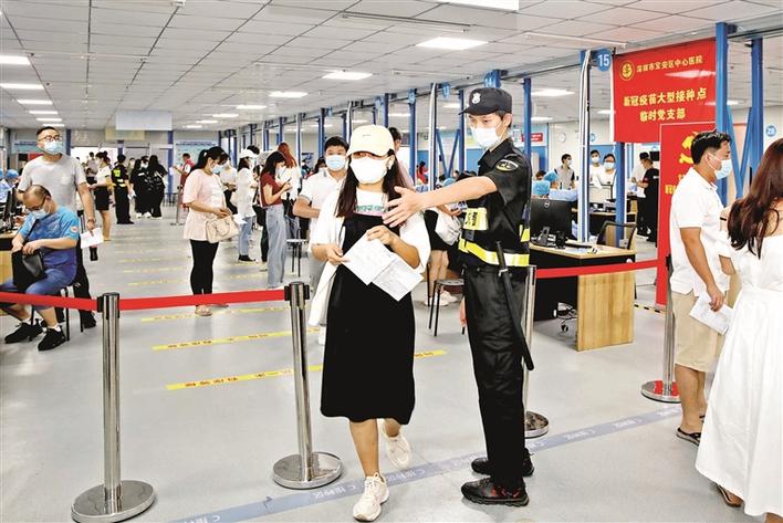 在新安街道海旺社区的壹号公馆社康疫苗接种点,前来接种疫苗的市民有序间隔排队,社区工作人员、网格员以及义工与医护人员携手,共助疫苗接种。护士长杨志容耐心答疑解惑,为接种疫苗后留观等待的人员送上凉茶,反复提示疫苗接种后的注意事项,为身处燥热夏日中的市民增添了安心。