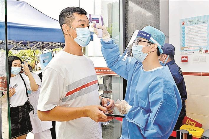 在新安街道壹号公馆社康疫苗接种点,医护人员为前来接种疫苗的市民测量体温。