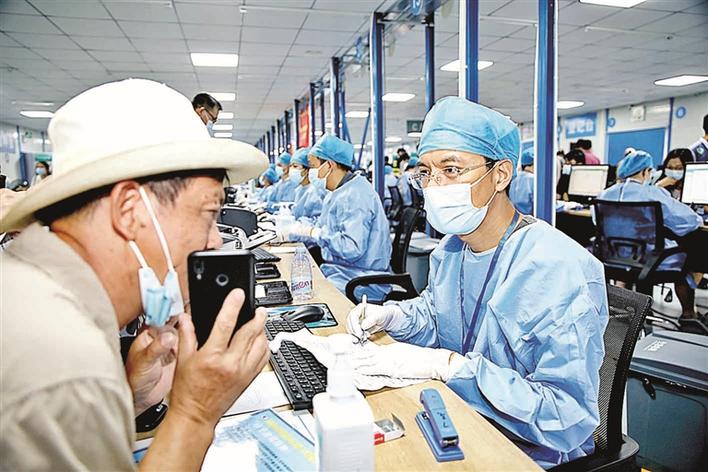 医护人员为市民填写相关表格资料。