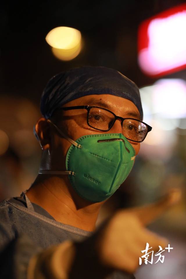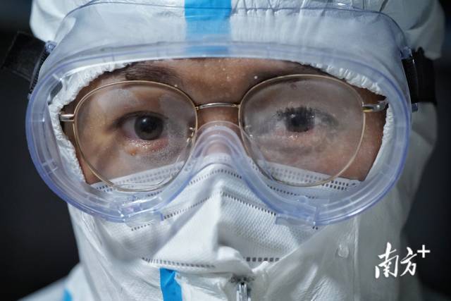 5月28日凌晨2时52分,佛山梁园采样点,来自佛山市口腔医院的郭少洪的护目镜下是一双被汗水迷糊了的双眼,额头上也满布汗珠。▼