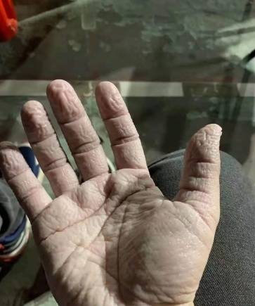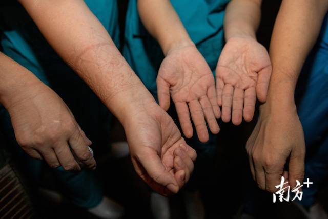 护士脱下手套后,被汗水浸泡的手都已起皱。▼