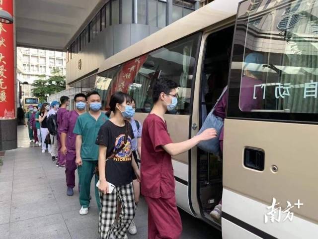 5月28日下午6时,广州7家三甲医院500名医护人员再出发,前往佛山开展核酸采样工作,当地居民有序排队检测。▼
