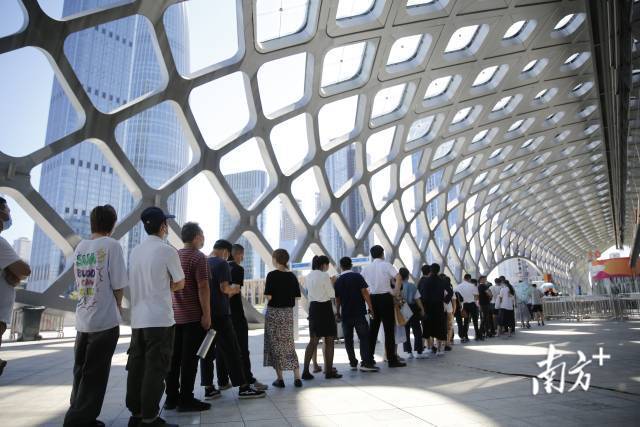 烈日炎炎,老广们自觉戴着口罩,有序排队,他们知道 ,这是对健康的负责,是对工作的支持。每个人同心战“疫”。