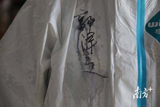 5月28日,广州市海珠区南洲街三滘联社的党员干部穿上防护服与医护人员并肩战斗。三个小时下来,联社社长郭泽文的里外都被汗水湿透了,写在防护服上的名字也被汗水冲浸模糊了。▼