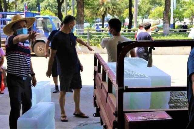 海龙街干部同企业一起运送冰块。▼