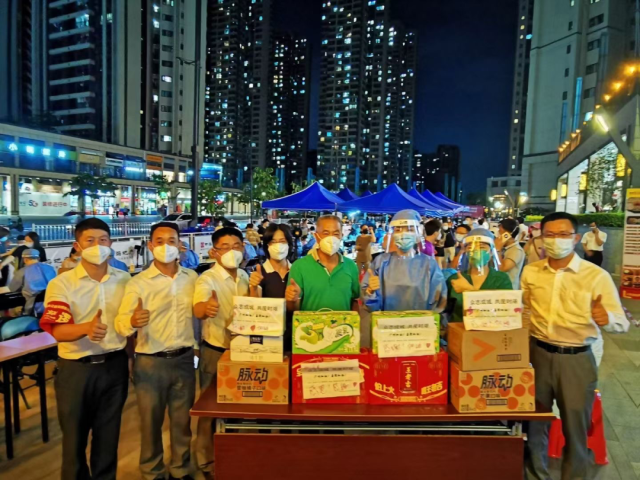 在广钢新城,商家们主动为工作人员及排队检测的街坊提供便利,纷纷搬来饮用水、遮阳伞、风扇,向工作人员送去饮用水、功能饮料、食品等。▼
