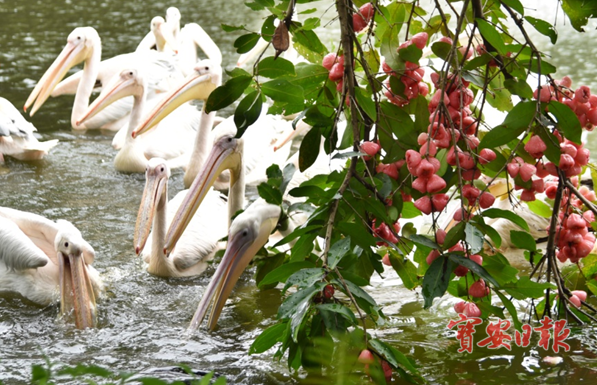 在深圳野生动物园长臂猿展区湖畔,高约6米的莲雾结满串串红色果实,如同树梢挂满红红小灯笼,在绿叶衬托下鲜明艳丽。莲雾低处结着果实的树枝延伸到湖水面上,洋红的果实在阳光照射下显得格外亮丽。成群结队的白鹈鹕在树果下的湖水中嬉戏玩耍、捕捉鱼类。白鹈鹕白色羽毛衬托红色果实,再添上闪耀的水花,别有一番景致。