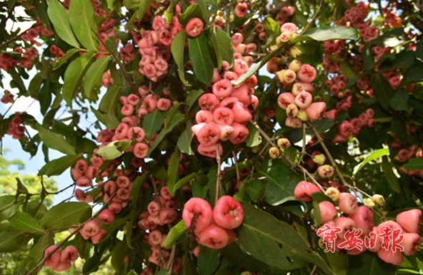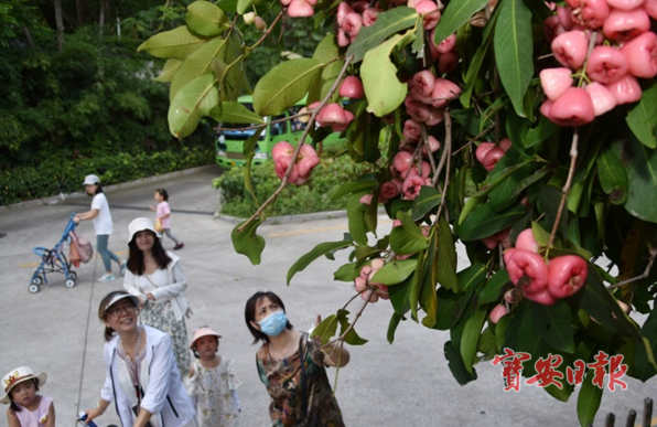 据了解,生长在深圳野生动物园里的莲雾,花期一般在3-4月,花为白色,花柱长2.5-3厘米。果实5-6月成熟,果实圆锥形,洋红色,长4-5厘米,顶部凹陷。目前已是果实成熟的时候,也就成为了该园一道靓丽的风景,纷纷吸引游客驻足观看,拍摄留念。