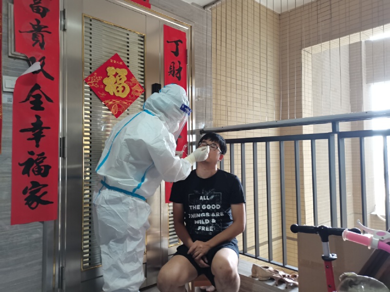 穿着密不透风的防护服,爬上楼还没来得及喘口气,宝安中医院(集团)中洲社康中心医生刘栋敲开居民的家门。“您好,我们来做核酸采样。你是木木(化名)的家长吧。”踏进家门后刘栋说道。刘栋是木木的家庭医生,木木的家长听到刘栋的声音马上说:“刘医生,这么热的天上门采样,你们辛苦啊。”