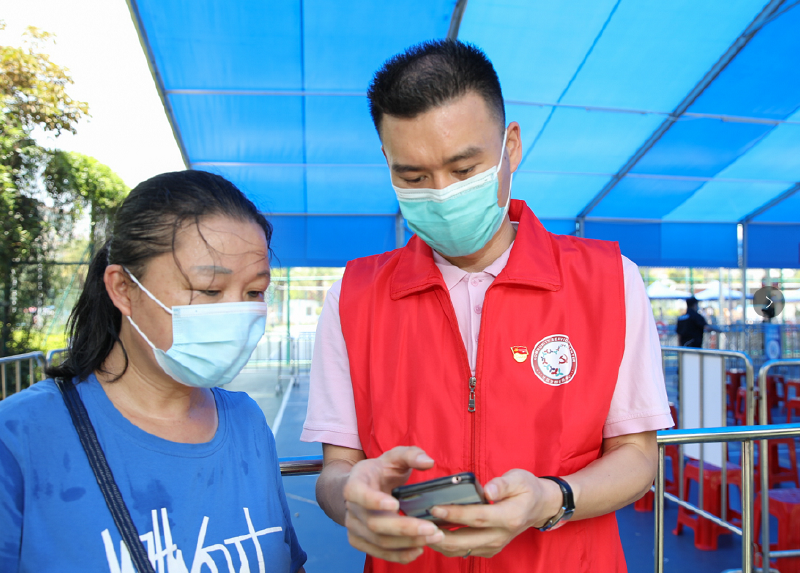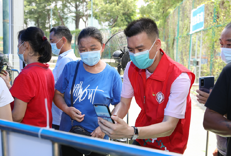 西乡街道永丰社区党委副书记黄伟权在西乡体育中心核酸采样点前帮助排队居民进行二维码填报。