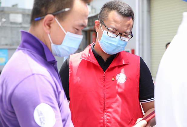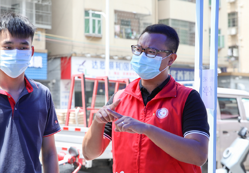 福永街道兴围社区工作站委员陈狄斌在现场维持队伍秩序并帮助群众填报信息。
