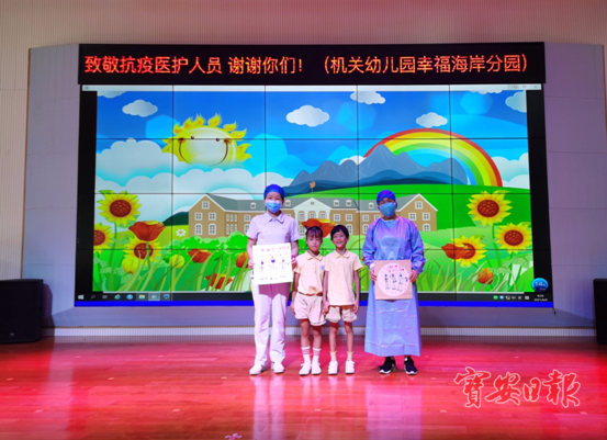 6月9日上午,宝安区妇幼保健院的医护人员来到区机关幼儿园幸福海岸分园,为孩子们进行核酸检测采样。现场,孩子们献上了用心演唱的歌曲视频《听我说谢谢你》以及手绘的抗疫小画作,向辛苦工作的医护人员表示感谢。