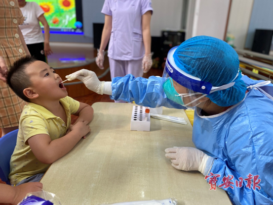 医护人员耐心为孩子们进行核酸检测采样