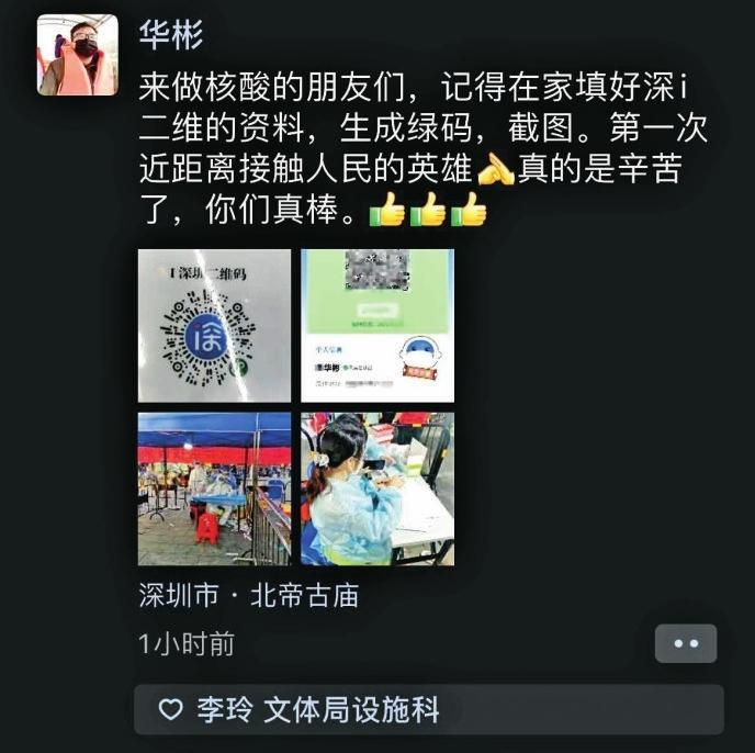 “干就完了!”宝安区男高音歌唱家李希文在金港商务大厦核酸采样点服务时,简简单单说出这么一句话后,就马不停蹄地投入到核酸采样的工作中,每一分钟在他眼中都显得格外珍贵。“要分秒必争,马虎不得!”他说。“深圳全民核酸检测任务繁重,来到一线,感受到了基层工作人员的不容易,要忍饥忍渴,还要耐心热情地服务每一位市民。”宝安作家十十说,“第一天早晨我出门着急,忘了吃饭,但竟然一天都没有感觉到饥饿。晚上回家后得犒劳一下自己,因为第二天还要奋战。”在社区服务的十十主要是帮助老人扫码、填写资料、维持现场秩序等。