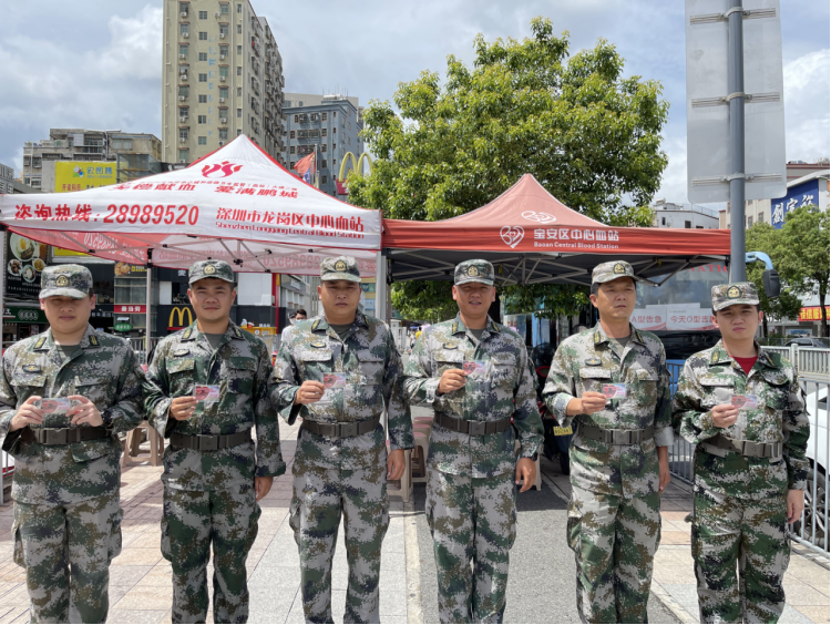 “献血是传递人间真情的纽带"。2021年6月13日上午,在献血日来临之际,宝安区石岩街道组织30多名民兵在辖区宝石南路献血点开展无偿献血活动,身穿迷彩服的他们一个个心怀无私、真诚奉献,用热血表达着爱心和善意,用义举传递着温暖和能量。