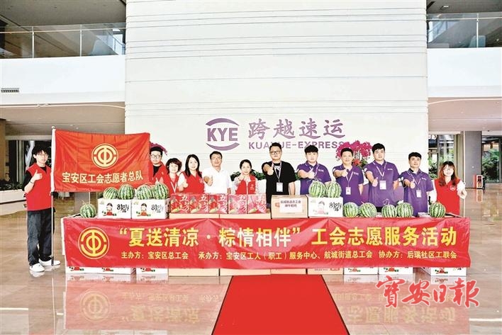 宝安区工会志愿者总队联合航城街道支队为多家企业高温作业岗位的劳动者送去节日问候和一批慰问品。