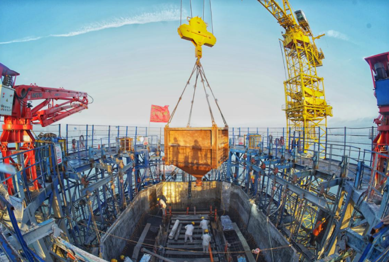 同时,项目成功研发高性能海工混凝土配合比,由常规工艺的“双掺”改为“多掺”,添加了硅灰和石灰石粉,并配套建设了海上集“水冷、冰冷、风冷”一体成型的智能化混凝土搅拌站,顺利解决了海工大体积混凝土施工难题,显著提升混凝土耐久性能。