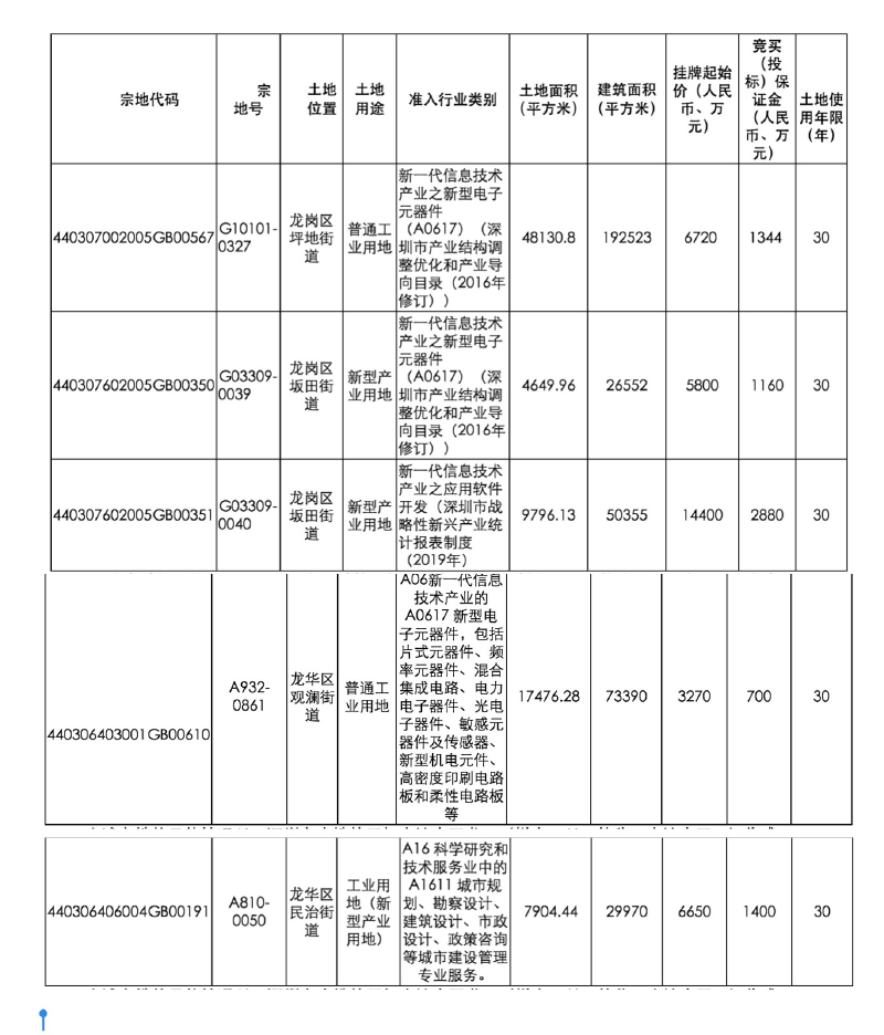 据了解,当天公布的5宗工业用地分别位于龙岗区坂田街道、坪地街道和龙华区观澜街道,准入行业类别分别为新一代信息技术产业之应用软件开发、新型电子元器件、科学研究和技术服务业中的城市建设管理专业服务。