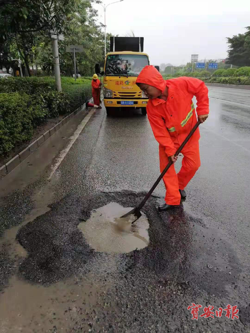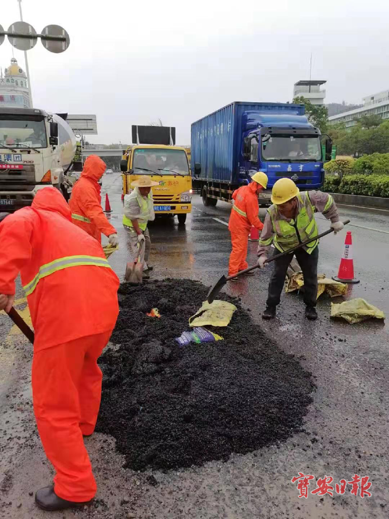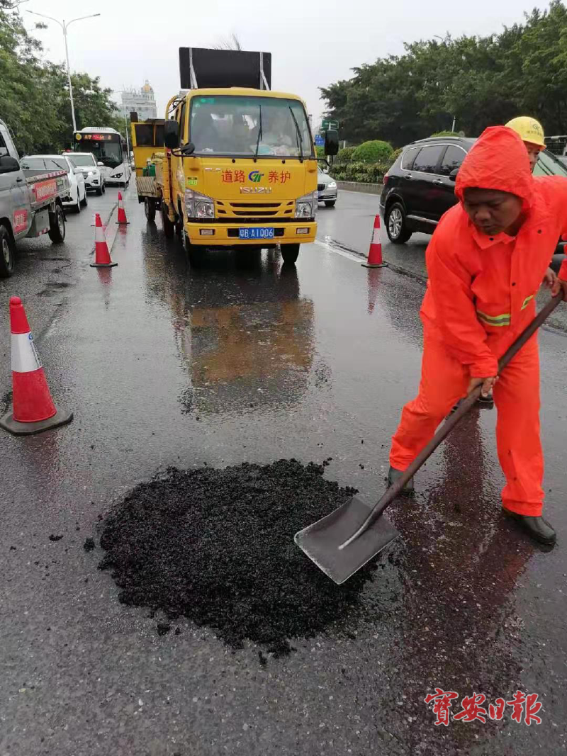 “沥青材料不可能完全隔水,一旦发生长时间强降雨,雨水将积聚进入沥青路面结构内部,使沥青粘附性减小,从而导致沥青表面剥落。”平通公司养护工作人员梁穆华告诉记者:“107国道上重载车辆较多,暴雨中,行车荷载的影响很容易让107国道路面出现松散、剥离、坑洞等病害。107国道是我们公司的养护道路,下雨天我们一定在这里守护107国道的安全。”据介绍,因为汛期强降雨天气仍然反复,泡水施工将影响沥青的黏合性,目前,宝安交通部门对107国道宝安段较小较浅的坑槽采用冷补料即时修复,而对不能即时修复大且深的坑槽,则采取钢板覆盖办法,确保行车安全,待天气放晴后将根据“原洞方补、浅洞深补”的原则进行热料规范施工修复。