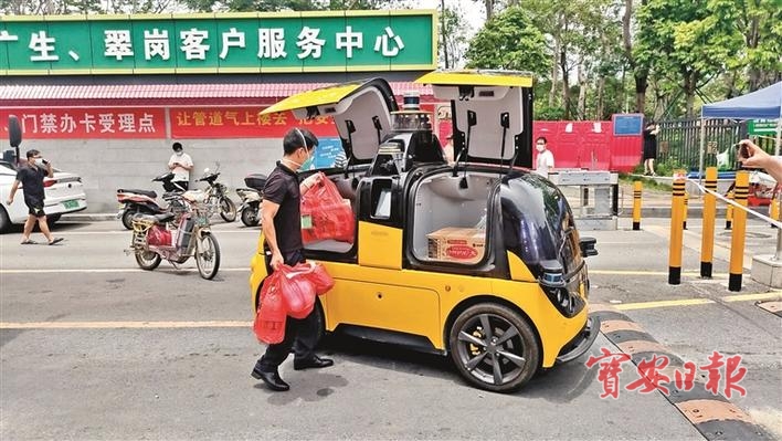 近日,福永街道福围社区来了一“位”特别的志愿者——美团无人配送车,烈日下、暴雨中,都见到它往返在社区道路上的黄色身影,一趟趟地为居民运送生活物资。