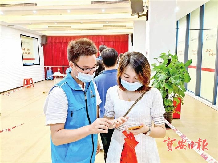 松岗街道碧头社区工联会主席唐复军在核酸采样点帮助市民查询健康码。