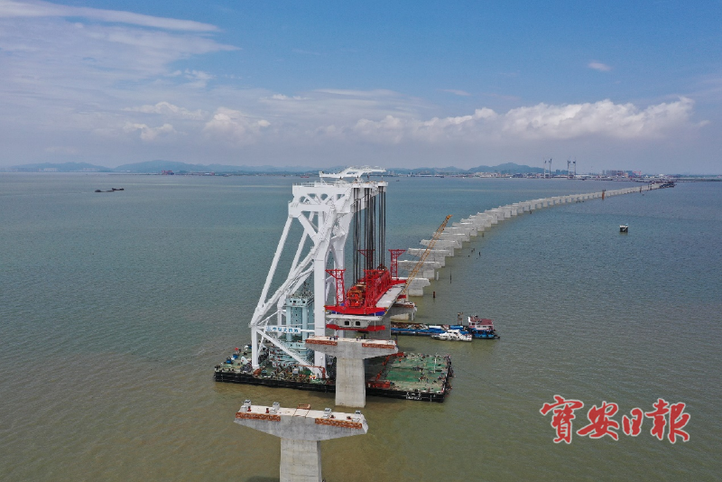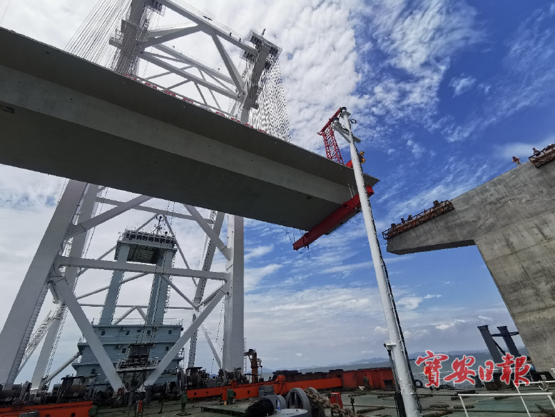 “深中通道海上非通航孔桥长11.4公里,根据泄洪区桥墩的不同设计距离,综合考虑工程造价、桥宽、吊重、建造技术和结构物耐久性等因素,桥面既有钢箱梁,也有混凝土箱梁。”深中通道管理中心桥梁工程管理部工程师金志坚介绍,“这次架设的60米混凝土箱梁为20米标准梁宽,共需浇筑约1037立方米混凝土,浇筑后重达2752吨,是目前行业内同类型箱梁中浇筑最大方量的混凝土箱梁。”今年4月,深中通道首片钢箱梁顺利完成架设,目前已完成共8片钢箱梁架设。